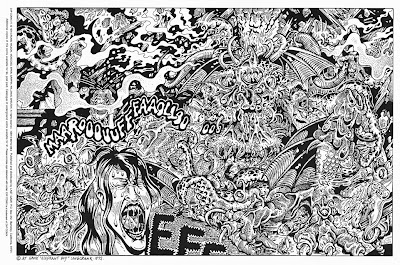 Underground comics in the sixties and seventies did this all the time - ZAP! for example (see Fig.B), was famous for it, making drug references seem as common as breathing, and featuring horrifyingly(and entertainingly!) detailed graphic scenes of sexual and/or violent natures (Fig.C), or art that was too confusing and gruesome and difficult to be considered acceptable by the mainstream (Fig.D). It was art that sought beauty where others saw filth. It was art for people who got it - anyone who didn't was encouraged to expand their consciousness to do so, or get the fuck out. MAD magazine/National Lampoon were also famous for doing stuff like that, but they also took the more hard-hitting, easy to understand route, making direct parodic shots at political figures, pop culture icons/events, etc. that the mainstream could latch onto more easily. I'm partial to stuff like ZAP! for the very reason that it made no sense whatsoever. It reminds me that life is a little more complicated than following people like Glenn Beck on their journey towards ultimate stupidity.(note - please see fig. E for the Big Ups back cover's direct inspiration)